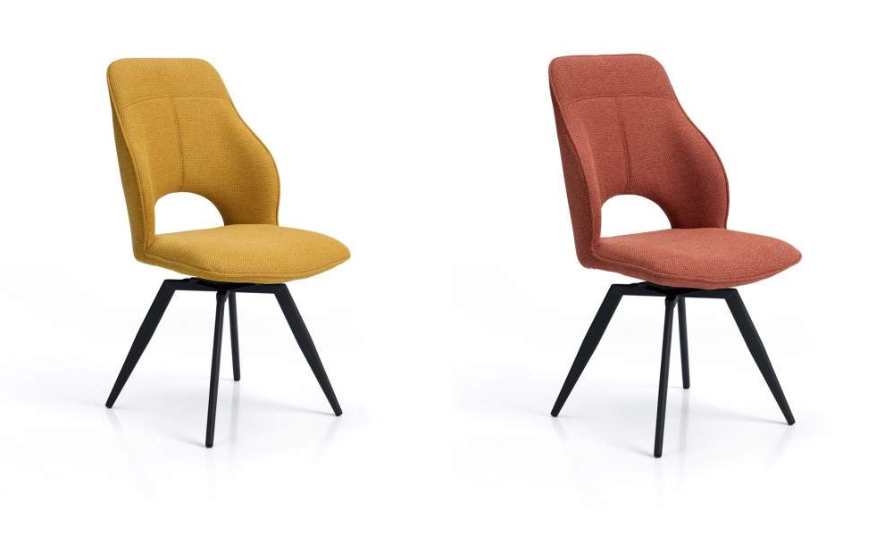 Dossier fixe. Assise rotative à 180° avec retour. Garnissage assise mousse polyester 25 kg/m³ et dossier 22 kg/m³. Pieds métal.