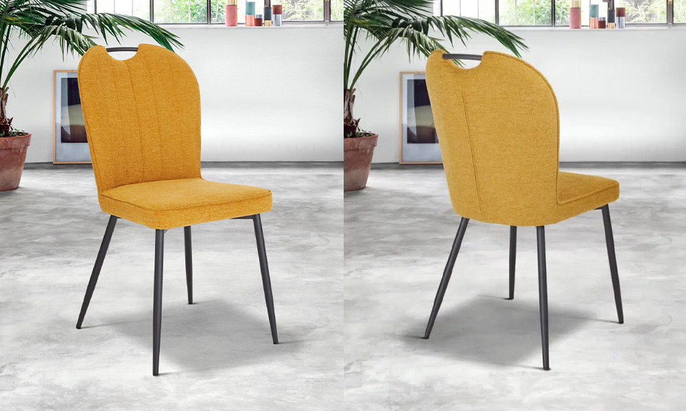 Assise et dossier tissu 100% polyester. Piètement métal. Densité mousse 28 kg/m3.