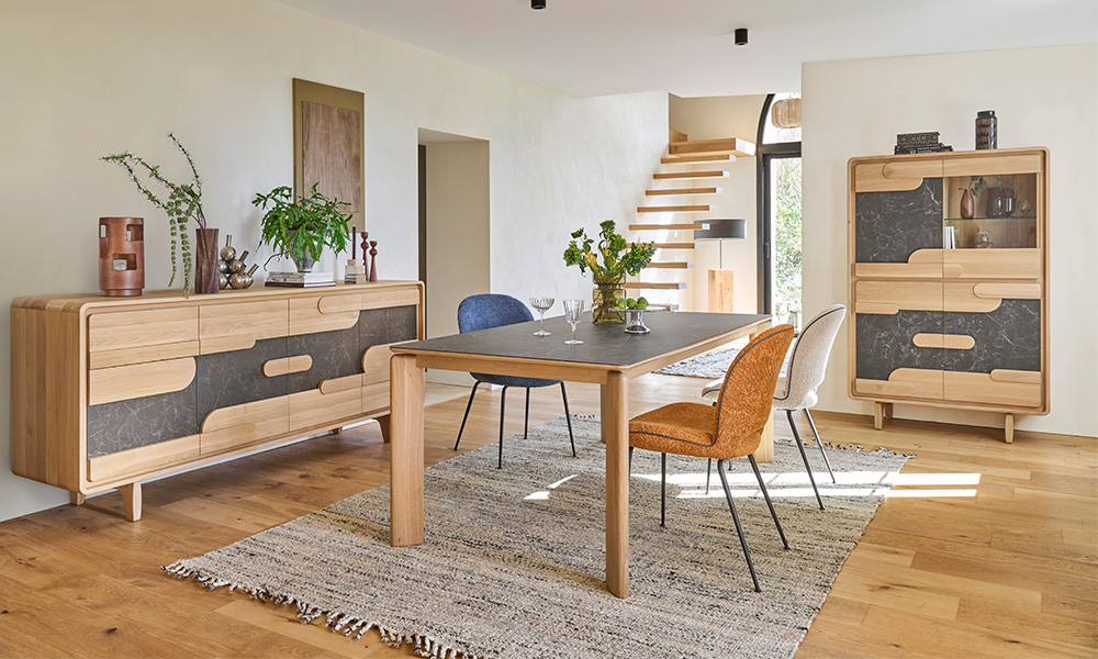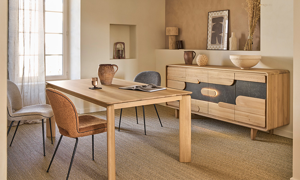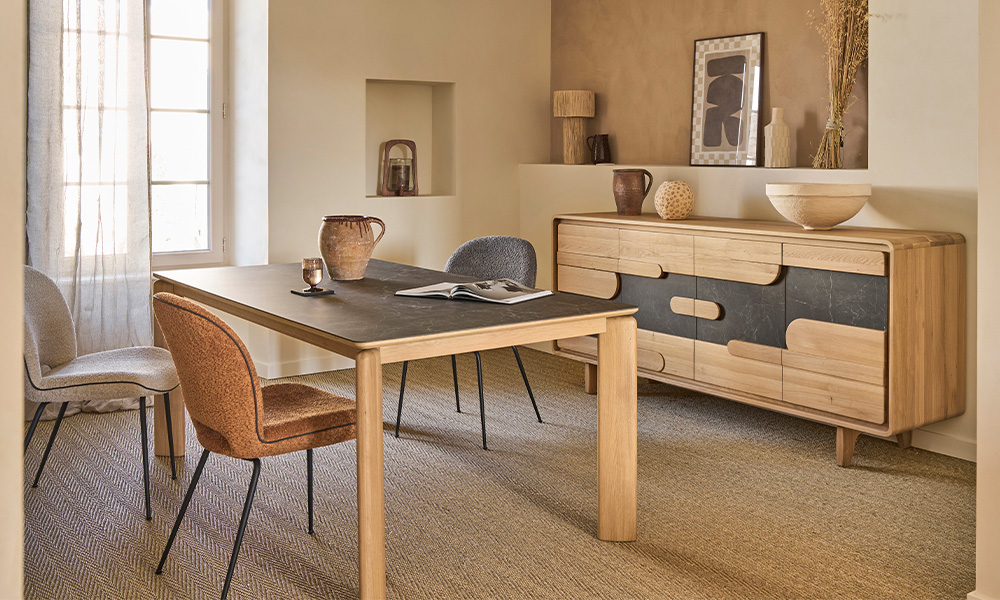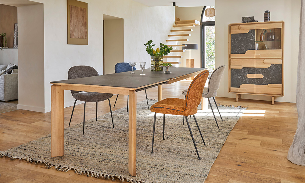 Table plateau céramique collée sur panneau de particules décor mélaminé noir avec alèse chêne massif. Plateau bois chêne massif. Allonges céramique collée sur panneau de particules placage chêne. Piètement chêne massif. Cadre métallique partie fixe et coulissante.